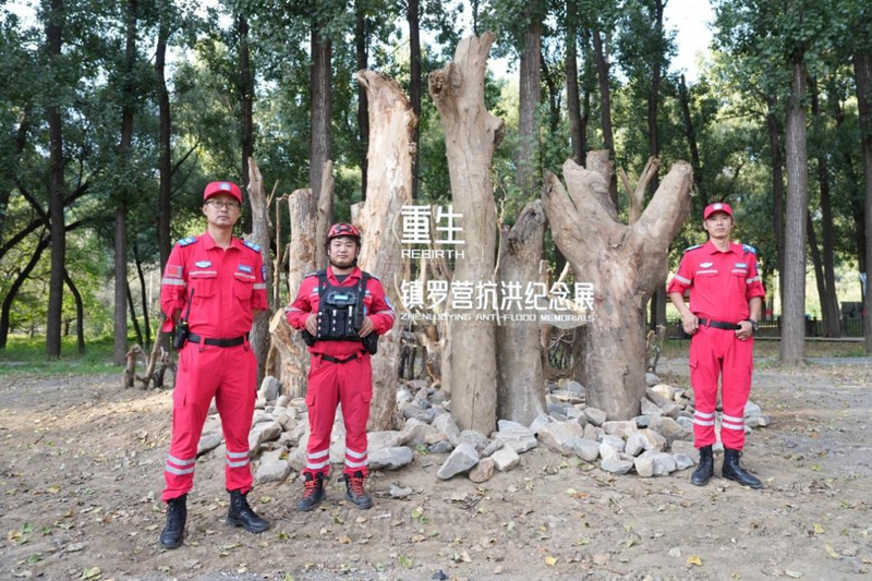 新京報(bào)訊 據(jù)“高大尚平谷”微信公眾號(hào),日前,幾位參加過平谷區(qū)鎮(zhèn)羅營鎮(zhèn)今夏抗洪搶險(xiǎn)的救援隊(duì)員,鄭重地穿上制服,來到《重生——鎮(zhèn)羅營抗洪紀(jì)念展》標(biāo)識(shí)前合影留念。他們身后標(biāo)識(shí)所在的藝術(shù)裝置,正是紀(jì)念展第一件作品《水線:我在鎮(zhèn)羅營》,它上面反射著微光的波紋高度,正是附近村子里當(dāng)時(shí)的洪水水位。