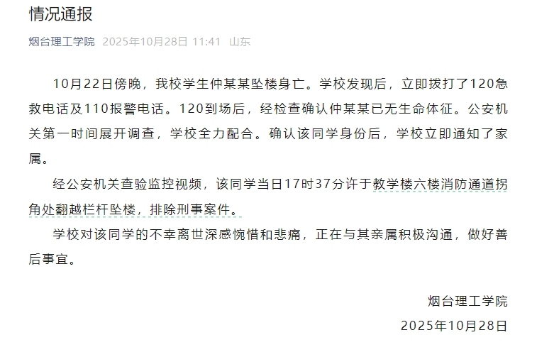 新京報(bào)訊 10月28日,煙臺(tái)理工學(xué)院發(fā)布情況通報(bào):